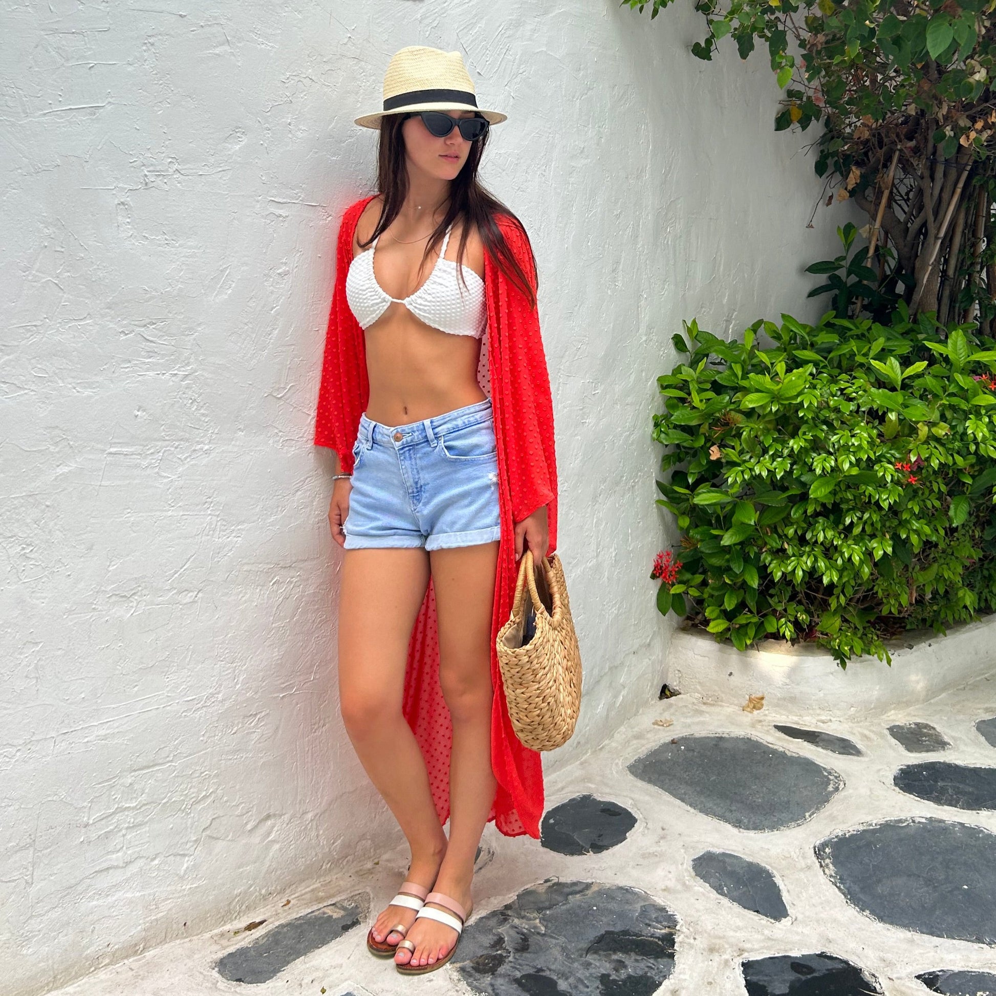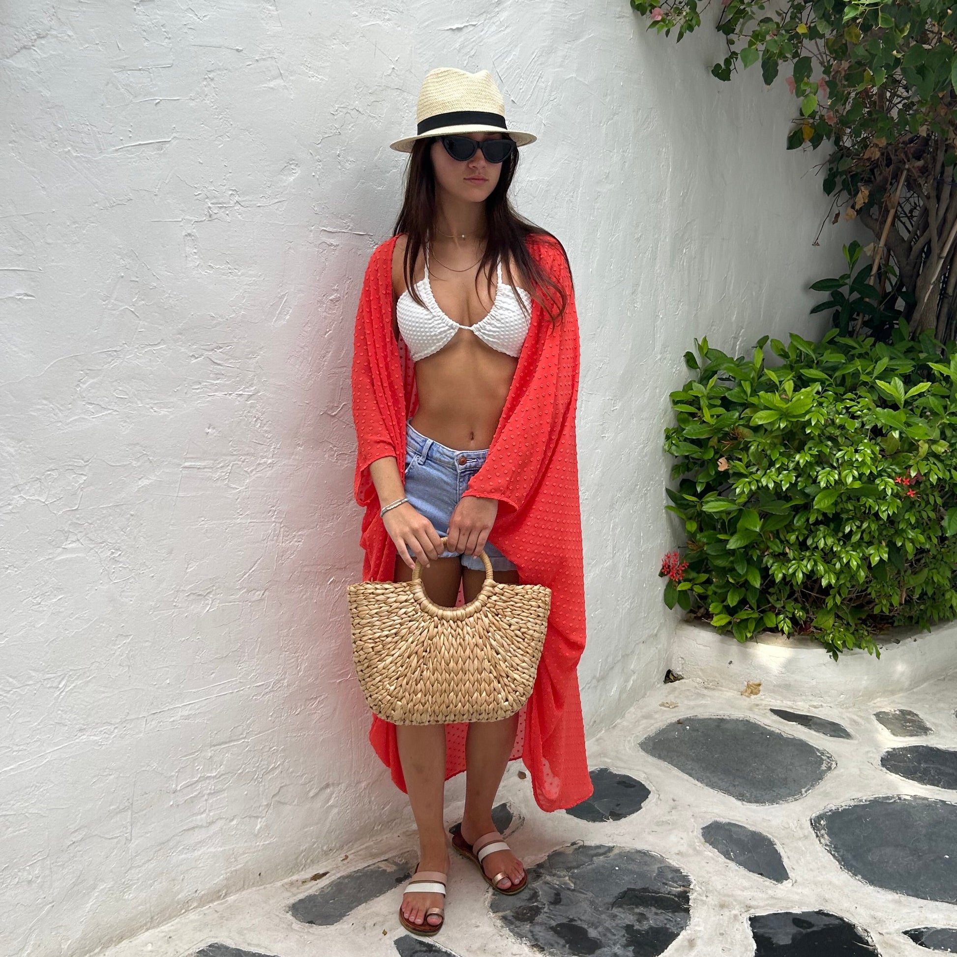 Kimono with batwing sleeve and three quarter length. Chiffon fabric and free size us to UK18. Stunning orange fabric with a texture spot. NB. The colour is orange and not coral or red.