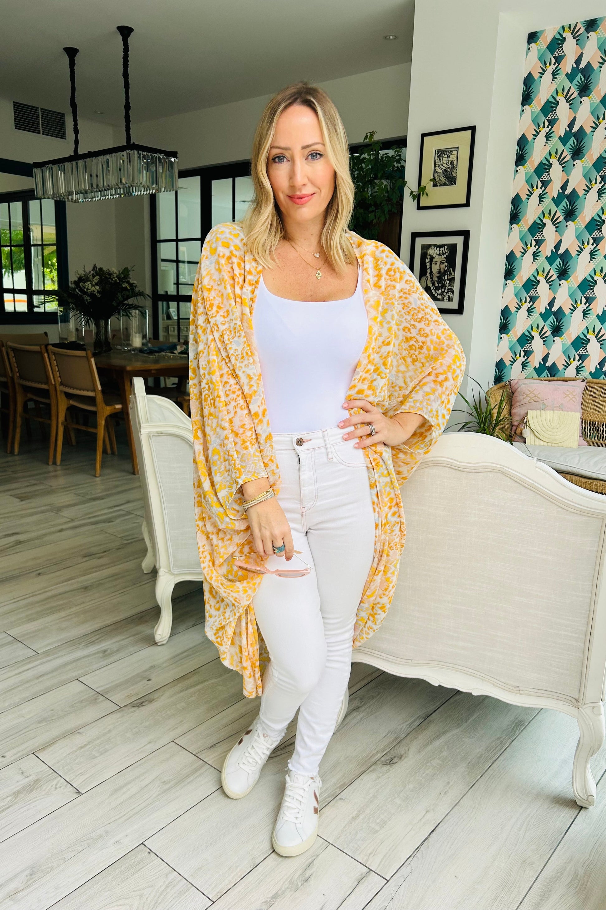 Kimono with batwing sleeve and three quarter length. Pretty leopard summer yellow and pale grey print chiffon! Wear over T shirt and jeans or shorts, or over swimwear! Free size up to UK18.