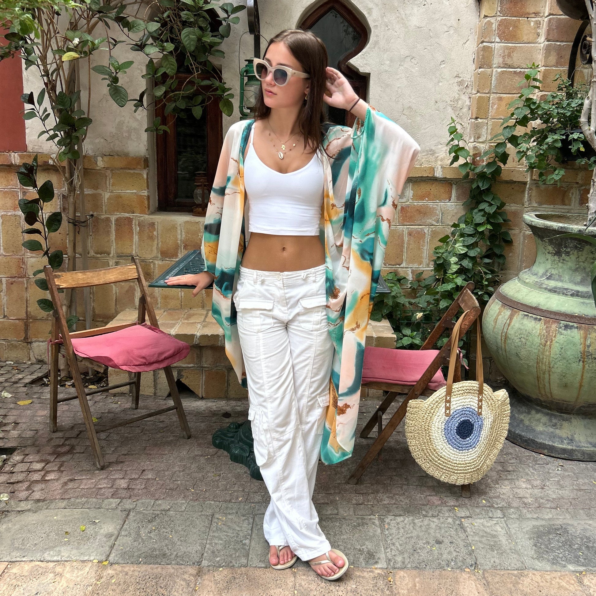 Kimono with batwing sleeve and three quarter length. Beautiful print in greens with blush pink and gold. A colour that anyone at all can wear. Perfect for Summer! Wear over T shirt and jeans or shorts, or over swimwear! Free size up to UK18.