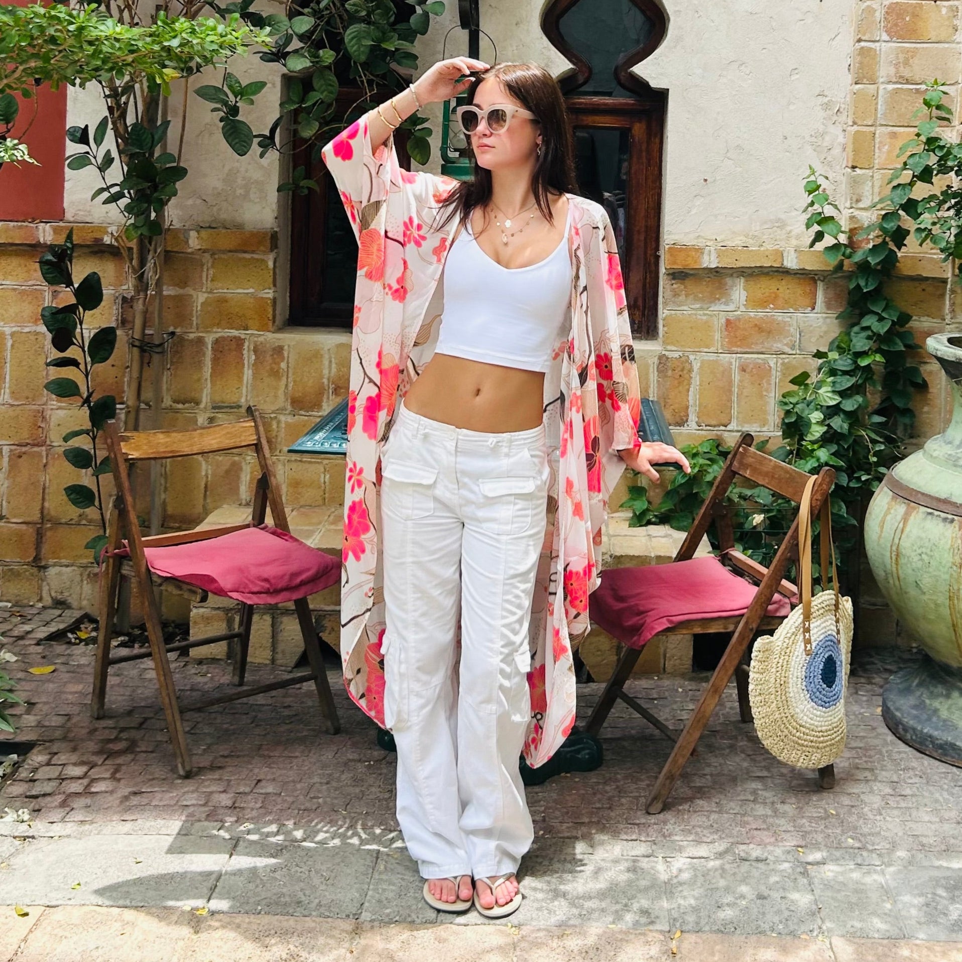 Kimono with batwing sleeve and three quarter length. pinky orange design on white. Perfect for Summer! Wear over T shirt and jeans or shorts, or over swimwear! Free size up to UK18.