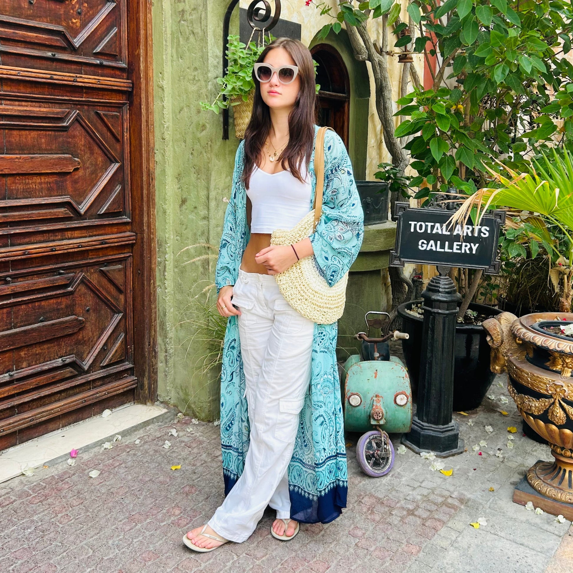 Kimono abaya full length in chiffon. Wear casually for day time or dress up for evening. Gorgeous turquoise and white print with navy boarder. Perfect piece for Summer1 So flexible and great for packing! Free size up to UK18.
