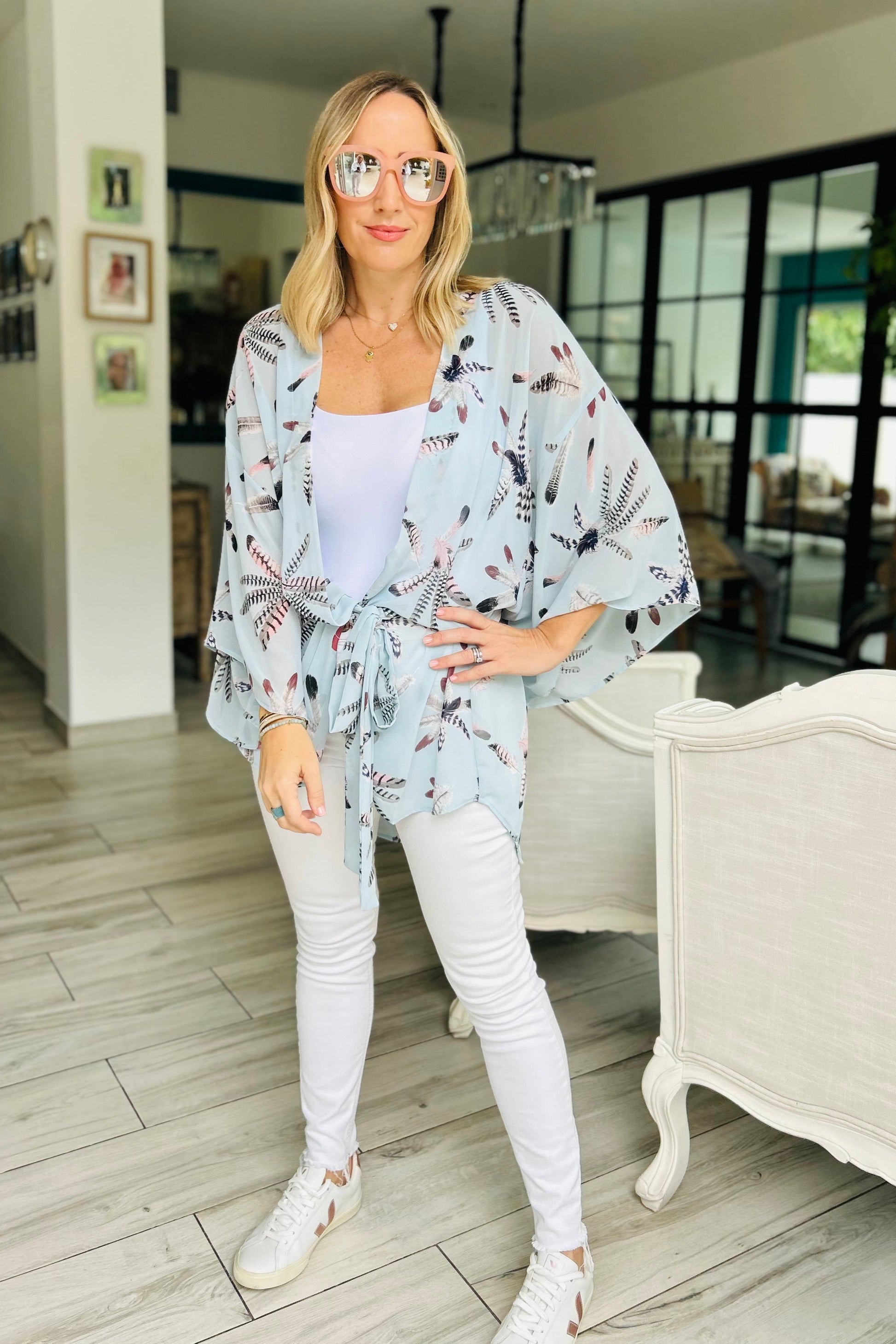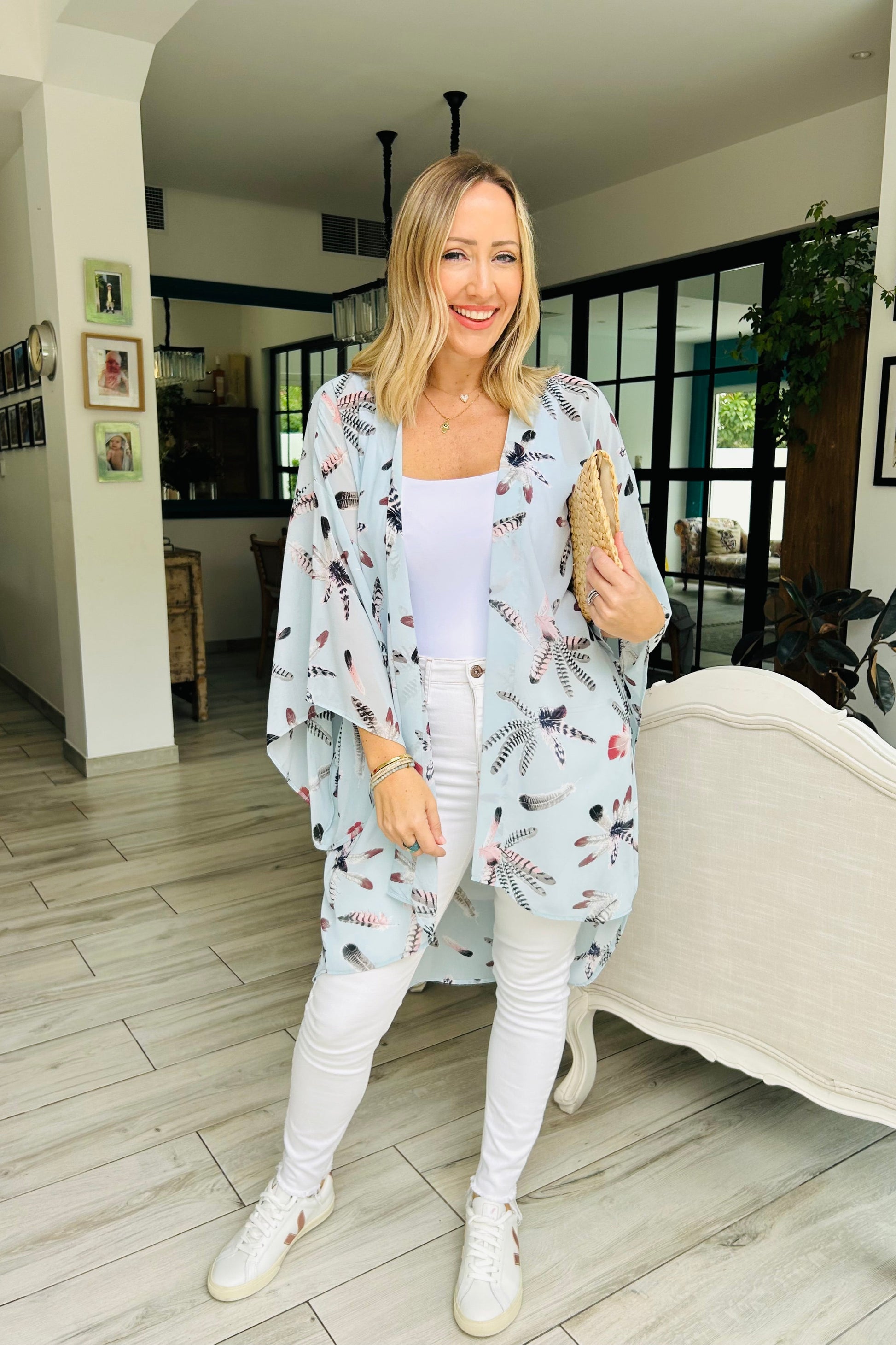 Kimono with wide kimono sleeve and medium length. This style is shorter at the front and longer at the back and comes with an optional belt. So you can wear it loose with out the belt, or with. Chiffon fabric and free size up to UK16. This chiffon print in baby blue with feather print is is lovely! Also great with your jeans or over a swim suit at the beach club!