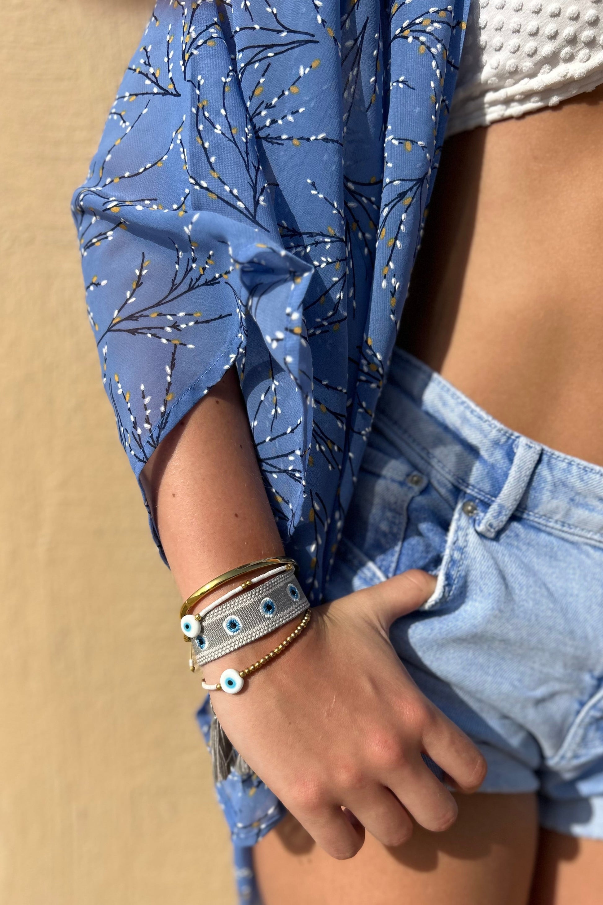 Kimono with wide kimono sleeve and medium length. This style is shorter at the front and longer at the back and comes with an optional belt. So you can wear it loose with out the belt, or with. Chiffon fabric and free size up to UK16. This chiffon print is a pretty blue colour with small print! Also great with your jeans or over a swim suit at the beach club!