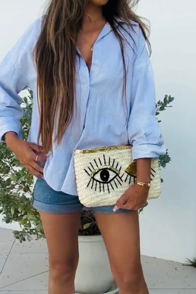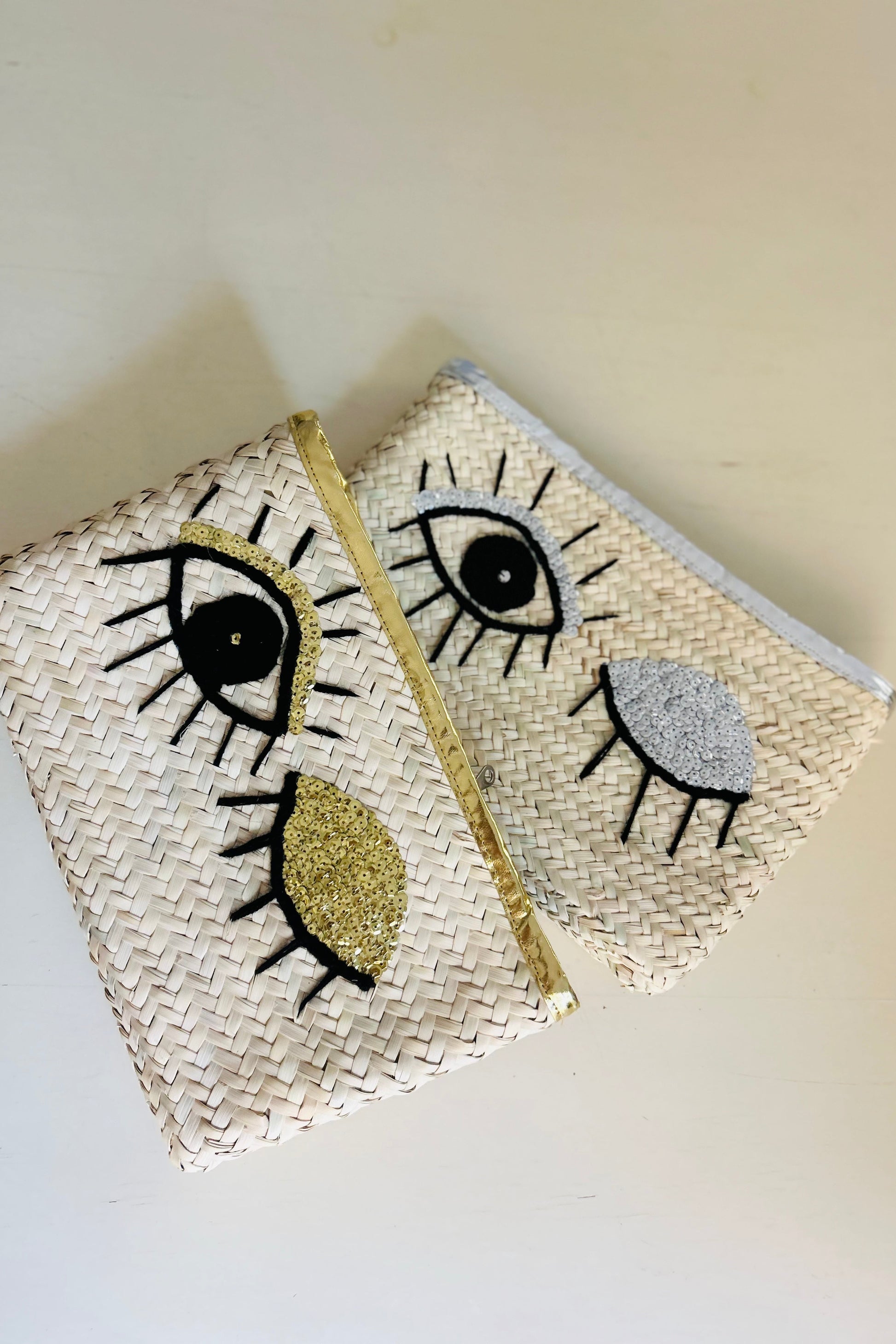 Hand made Moroccan Clutch bag in natural with a gold sequin winking eye! This is such a fun and adaptable bag, with zipper to close and trimmed in silver.
