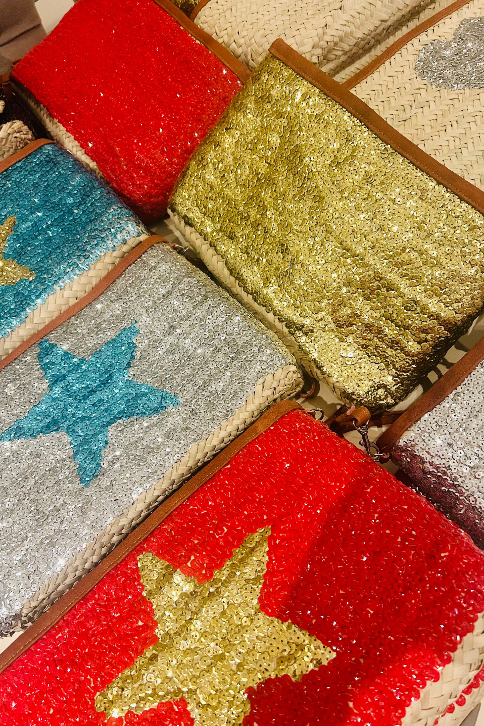 Hand made Moroccan Clutch bag fully covered in red sequin (front and back) with gold star! This is such a fun and adaptable bag, with zipper to close and handy detatchable wristlet, and trimmed in leather.