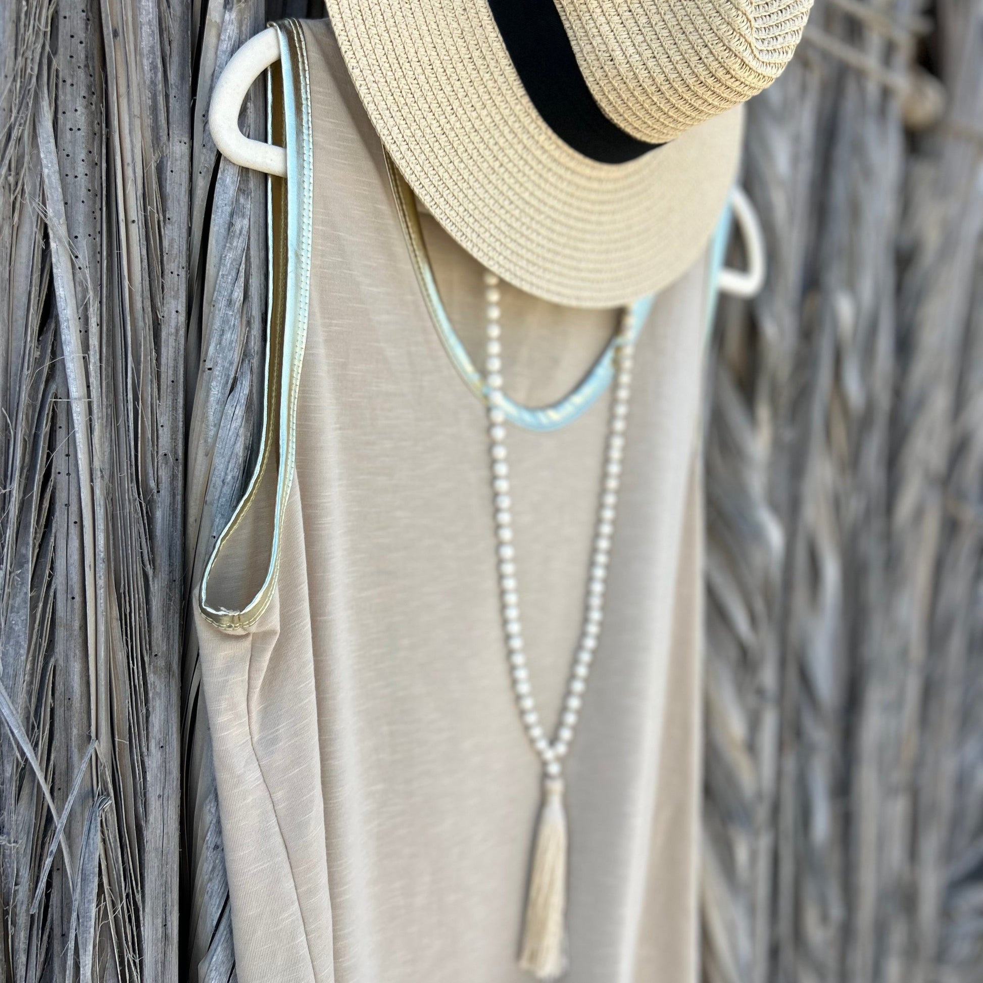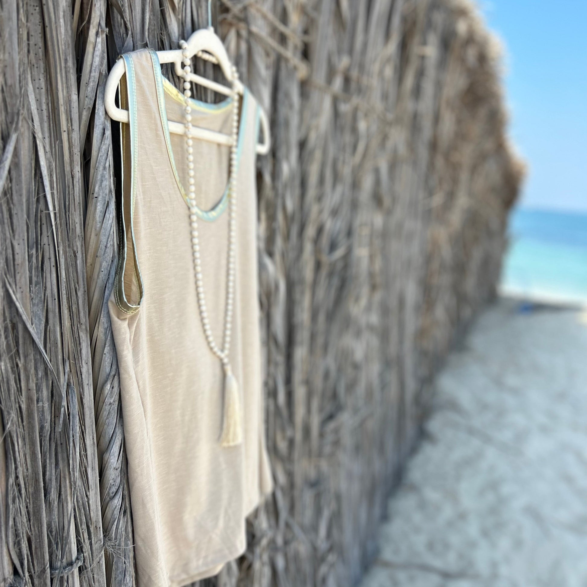 Beige tank top with gold trim on the neckline and sleeves. A great casual piece to wear with shorts or dress up with a jacket and jeans! This tank top style comes in a Small (8-10) Medium (10-12) Large (12-14) and XLarge (14-16)