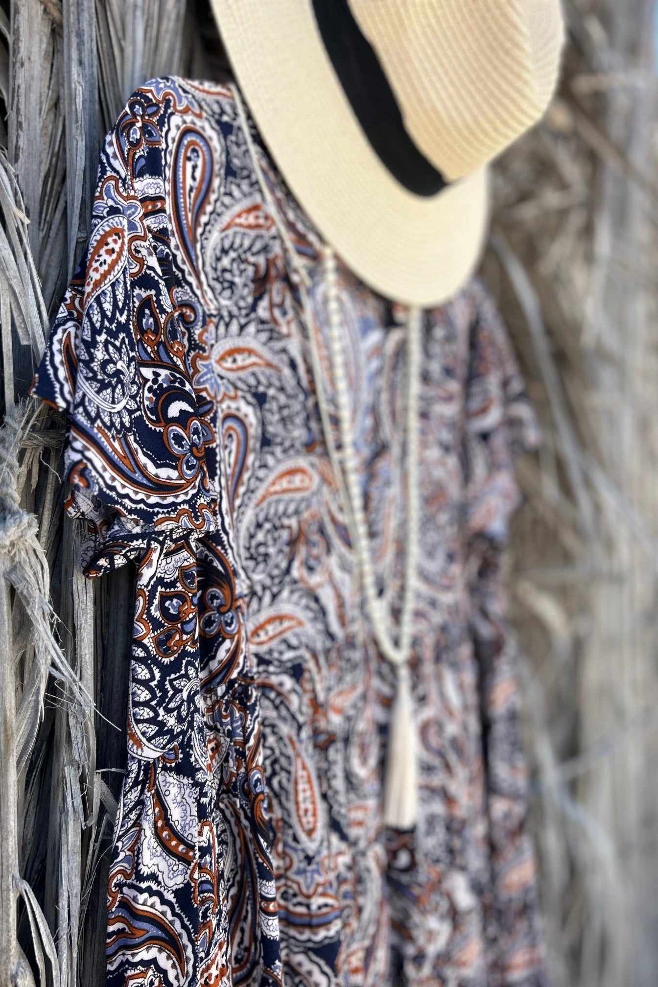 Pure cotton viscose dress, with mandarin collar with cream piping trim and V neck. Short flutter sleeve and a full tiered skirt. Length is on the knee (for 170cm tall). Beach dress, day dress, that is cool and comfortable. Wear as a Summer dress, but layer with a jumper or denim jacket for cooler weather. Accessorise with a cream tassel necklace and one of our cross body pom pom bags! This is a gorgeous navy paisley printed fabric! Sizing is for UK10 - 14. - loose fit.